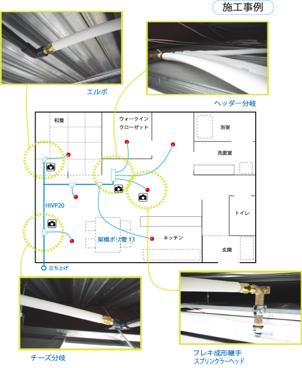 架橋ポリエチレン管は、ブルーでもピンクでもないスプリンクラーとしての第三色のホワイト被覆付を採用。原則スプリンクラー配管上は保温不要ですが、架橋ポリエチレン管の施工上の保護をするために被覆を推奨。配管が共回りせず、継手のみが回転しねじ込み可能、かつ外面シールの大流量ワンタッチ継手(MV-SPW)を使用。